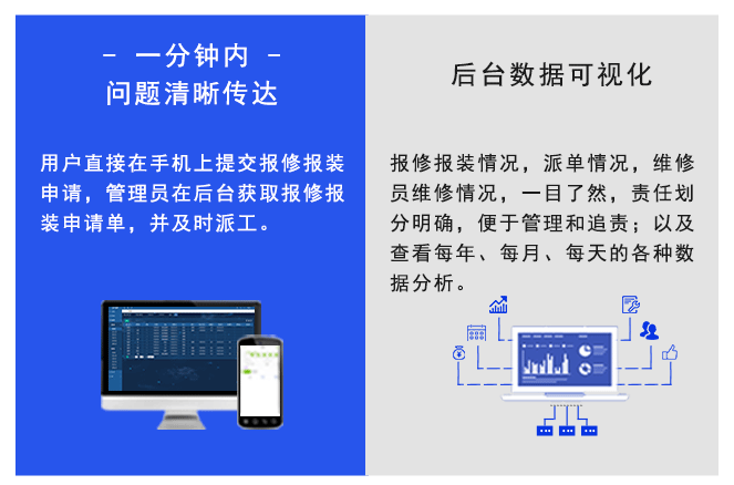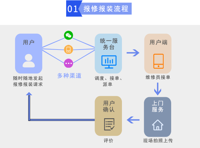 在線報修報裝系統(tǒng),可幫助企業(yè)實現(xiàn)輕松、規(guī)范、細致的報修、派單、接單、維修報裝、評價等一體化管理工作,提高管理效率、實時掌握、準確、全面的報修報裝進度,高效控制報修報裝全部過程。